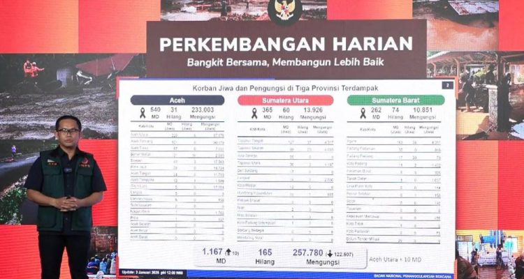 JATIMAREA.COM – Badan Nasional Penanggulangan Bencana (BNPB) melaporkan adanya penambahan korban jiwa akibat bencana alam yang melanda wilayah Aceh Utara. Hingga Sabtu (3/1/2026), total kumulatif